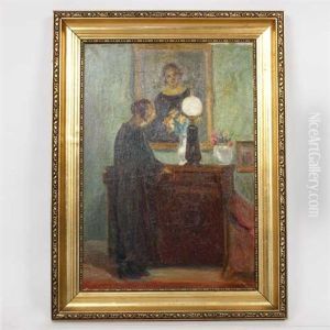 An Interior With A Woman Reading At A Bureau