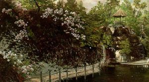 En sommerklaedt dame i et lysthus