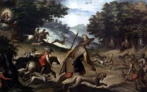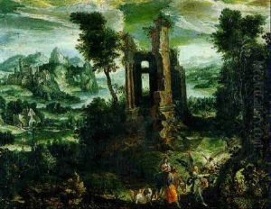 A Fluvial Landscape With Figures Hunting And A Woman Selling The Spoils Of The Hunt To A Man