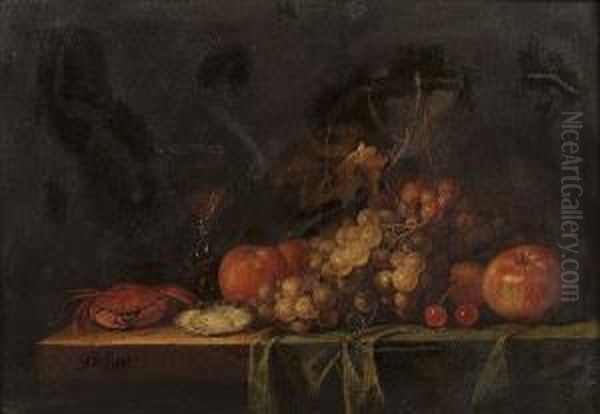An Oyster, Cherries, Oranges, An Apple And A Glass Of Wine On A Partially Draped Table