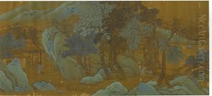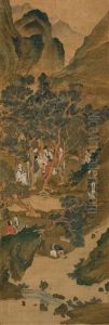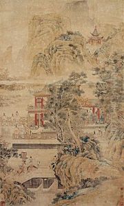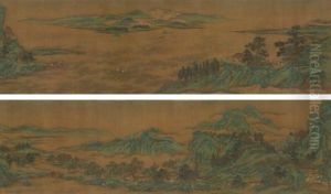 Personnages Evoluant Dans Un Paysage Lacustre Surplombe De Montagnes Et De Pagodes