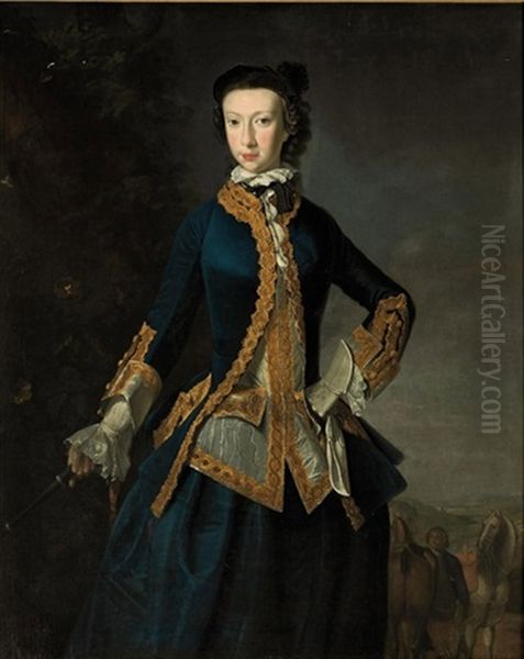 Portrait Of A Lady In A Blue Coat And Skirt, And White Waistcoat, With Gold Embroidered Trim, A Whip In Her Right Hanf, In A Landscape