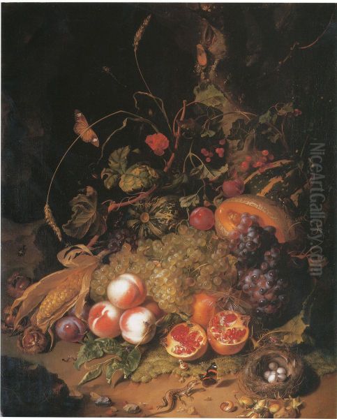 Stilleven van vruchten, met insecten en een vogelnest op een ondergrond van mos met kiezelstenen, 1710 gedateerd