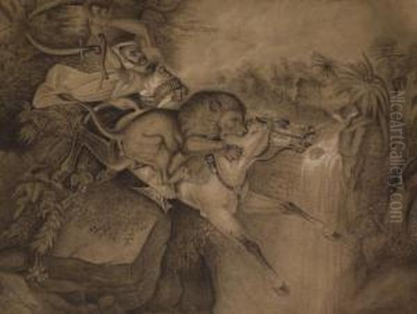 Un Lion Attaquant Un Cheval Tandis Que Son Cavalier S'accroche A Une Branche, Dans Un Paysage Exotique