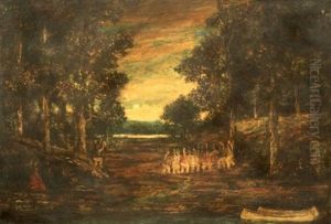 Woodland Interior Scene With Teepee, Canoe And Figures