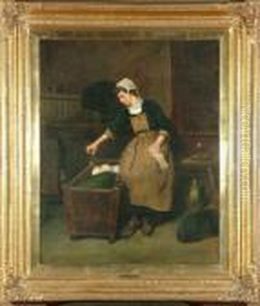 A Cottage Interior With A Mother Watching Over Her Sleeping Baby.