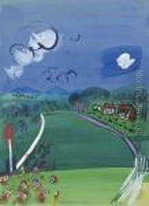 Paysage Aux Cypres Et Papillons Sur Fond Bleu