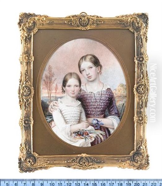 The Misses Alice And Minney Squarey Of Salisbury: The Former, Wearing Mauve Dress And Sash, White Under-dress, Jet Necklace, Her Arm Around Her Younger Sister; The Latter, Wearing White Dress With Lace Trim And Cuffs