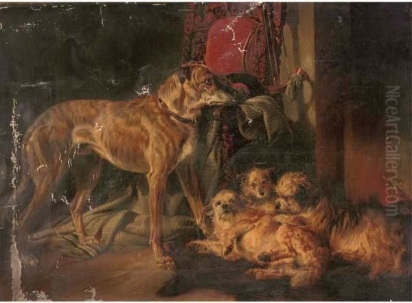 A Scottish Deerhound And Three Dandy Dinmonts By An Open Fire