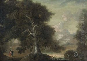 A Mountainous Wooded Landscape With Figures In The Foreground By A Lake And Deer In The Background