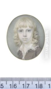 A Young Boy, Wearing Brown Coat, White Chemise With Lace Edged Collar, His Blond Curling Hair Falling To His Shoulders