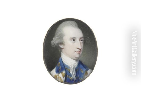 A Gentleman, Wearing White Coat With Blue Collar And Matching Blue Waistcoat, White Chemise, Stock And Lace Cravat, His Powdered Wig Worn En Queue