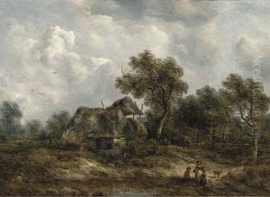 Figures Outside A Thatched Cottage, Children Playing Next To A Stream Nearby