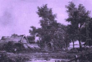 A Fisherman In A Rowing Boat On A River, A Cottage Beyond