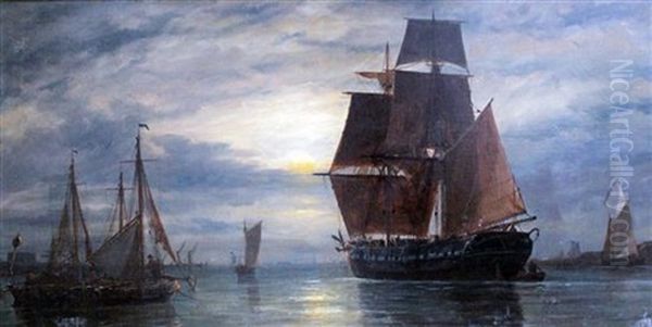 Gosport Traders Unloading By Moonlight Oil Painting by Richard Henry Nibbs
