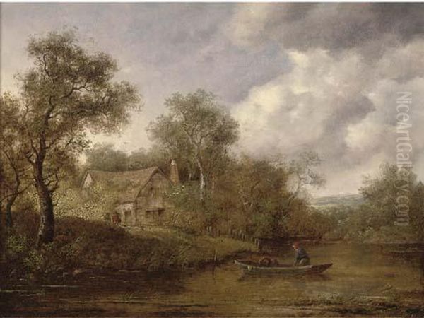 A Fisherman In A Rowing Boat On A River