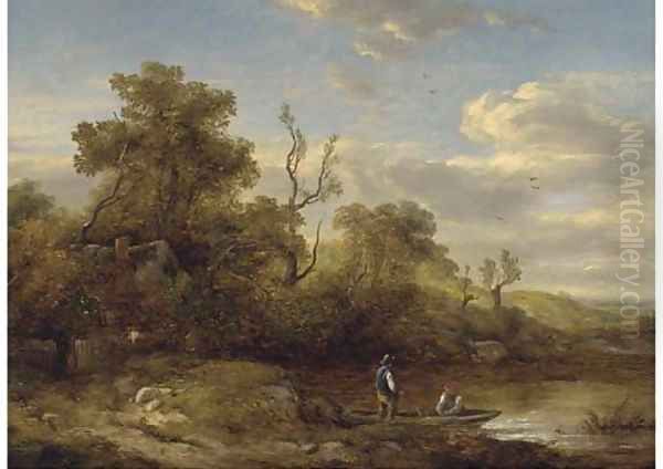 Figures in a boat before a cottage