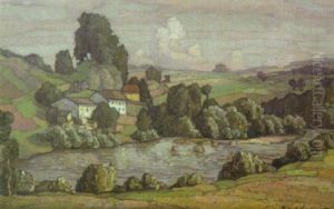 Sommerliche Flusslandschaft (franken?) Mit Einer Ortschaft Zwischen Baumen Und Vor Einer Hugelkette