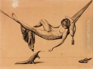 "liegender Weiblicher Akt Mit Facher, Einen Affen Mit