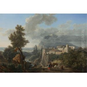 Figures Resting By A Windmill, A Fortified Town Beyond