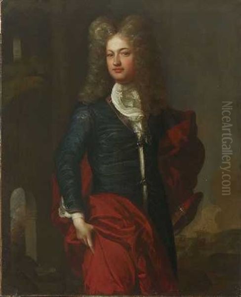 Bildnis Eines Jungen Mannes In Blauem Rock Und Rotem Umhang Vor Ruinenarchitektur