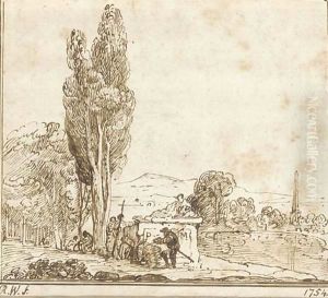 An Italianate Landscape With Two Figures Conversing Beneath A Hillside, Classical Buildings On The Hilltop, A View Across A Distant Plain Beyond