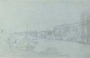 A Figure Resting On A Riverbank With A Town Beyond