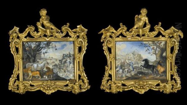 Landscape With Pairs Of Animals And Birds Including Tigers Leopards Elephants And Peacocks (#) A Landscape With Pairs Of Animals And Birds With Figures Sacrificing Antelope On A Stone