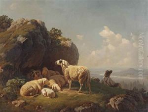 Rastender Hirtenknabe Mit Ruhenden Schafen In Gebirgslandschaft