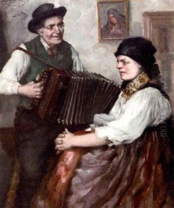 Ein Bauer In Dachauer Tracht Bringt Seiner Frau Ein Standchen Dar