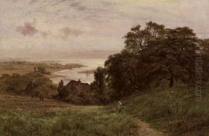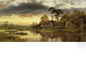 A Extensive Country Scene; Chickens Feeding, A Pond And Cottage In The Foreground, View To Cattle And A Farm Beyond