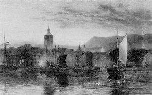 Parti Fra En Lille Havneby, I Forgrunden Hestekoretoj, Solnedgang
