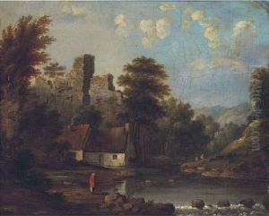 Figures by a riverside cottage, a castle ruin beyond