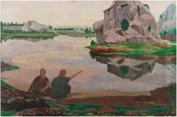 Western Landscape With Two Figures By A Lake In The Foreground, Hills Beyond