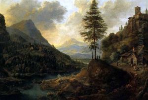 Gebirgige Flusslandschaft Mit Einer Turmruine Und Figuren