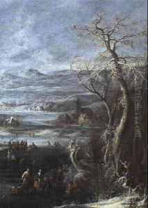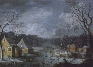A Winter Landscape With A Figure Skating On The Ice And Other Figures In The Snow Near A Village