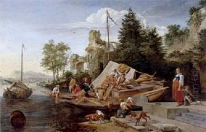 An Extensive River Landscape With A Barge, Figures, And Livestock And A Ruined Castle