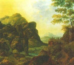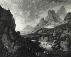Gebirgige Landschaft Mit Einem Sturzbach Und Vielen Figuren