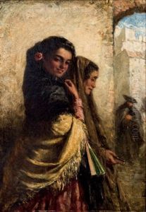 Two Spanish Beauties Holding A Fan With A Landscape Visible In The Distance