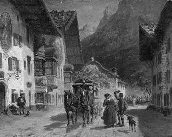 "ankunft Der Postkutsche In Mittenwald". Sign. Ol Auf Karton. 9,5 X 12,5 Cm. Rahmen