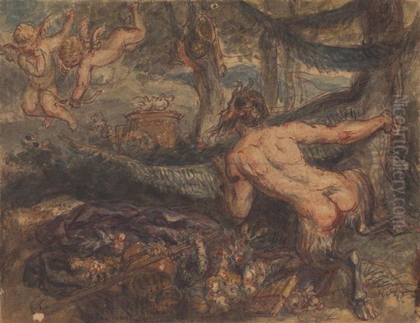 Pan, Spying, From Behind a Tree, at Putti, Shooting Arrows