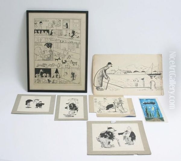 Orig. Drawings: 6 Original Drawings By Robert Storm P. + One Watercolour. One Framed, 4 Mounted On Cardboard. [no Date]