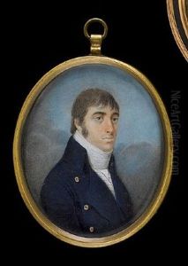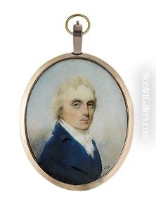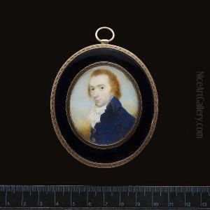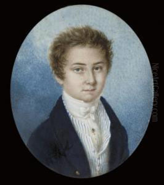 A Young Boy, In Open Blue Coat, Blue Striped White Waistcoat, A Gold Stickpin In His Pleated Shirt, Tied White Cravat