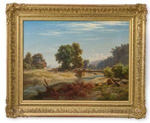 Bachlandschaft Mit Kuhherde Und Ziegen Beim Uberqueren Einer Kleinen Brucke