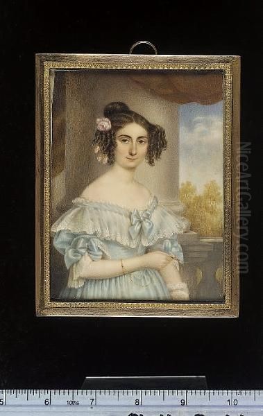 A Lady, Called Pauline Farrere, Baronne Saint-andre, Standing By A Balustrade, Wearing Low-cut Pale Blue Dress With Bows And White Lace Cuffs At The Short Sleeves And White Lace Collar Tied With Pale Blue Ribbon Bow At Her Corsage, She Holds A Gold Lorgne