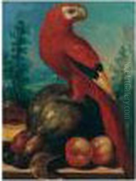 Still Life Of A Macaw Together With Melons, Peaches And Plums, Upon A Stone Ledge, A Wooded Landscape Beyond