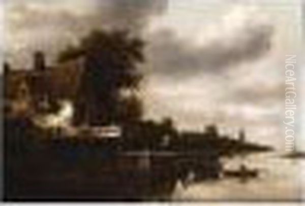 A River Landscape With Fishermen On A Quay And Houses Nearby