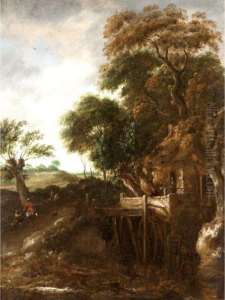 A Wooded River Landscape With A Mill And A Cavalier Giving Alms To A Beggar