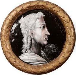 A Lady, In White Dress With Short Lace-bordered Sleeves, Seated On Gilt-metal Studded Red Leather Chair, Holding A Book In Her Right Hand, Upswept Dark Hair; Pillar, Balustrade, Foliage And Sky Background
