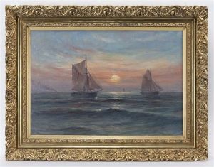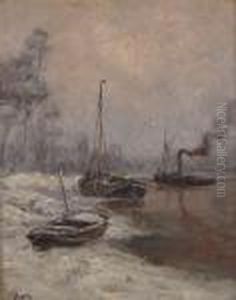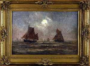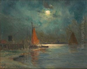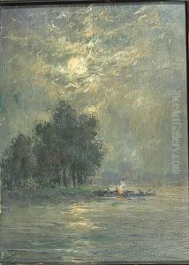 "boote Am Flussufer Bei Mondschein ". Sign. Ol Auf Lwd. Rest. 50,5 X 70 Cm. Rahmen